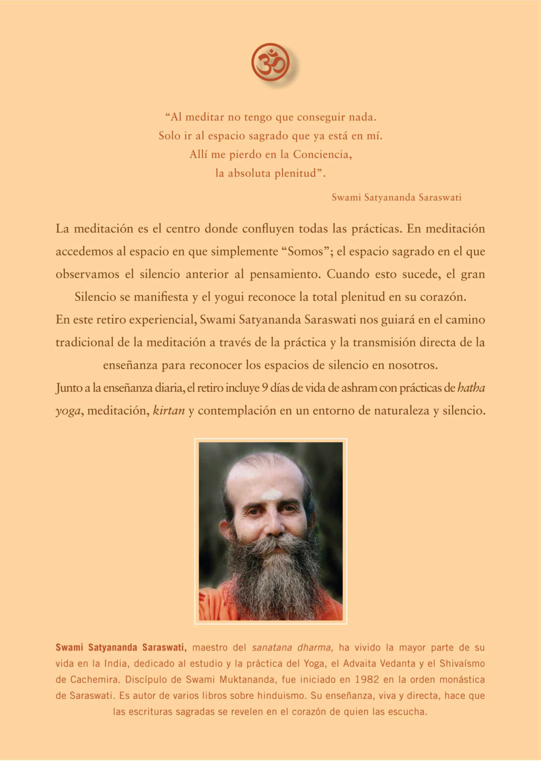 En este retiro experiencial, Swami Satyananda Saraswati nos guiará en el camino tradicional de la meditación a través de la práctica y la transmisión directa de la enseñanza para reconocer los espacios de silencio en nosotros.
